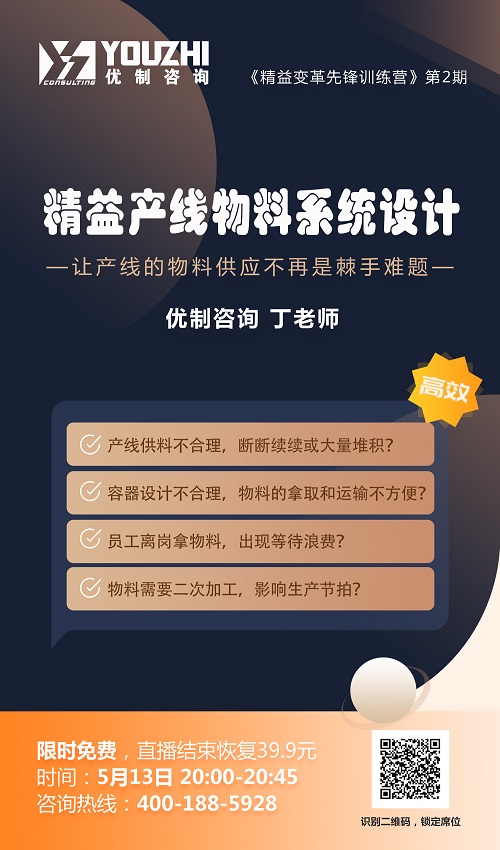 出現以上問題的主要原因之一,就是缺乏對產線物料供應系統的精益設計。如何做到既不影響生產節拍,又能保證產線的物料庫存水平維持在低位?5月13日晚20:00,優制咨詢丁老師教你科學地設計精益產線物料系統,讓產線的物料供應不再是棘手難題!