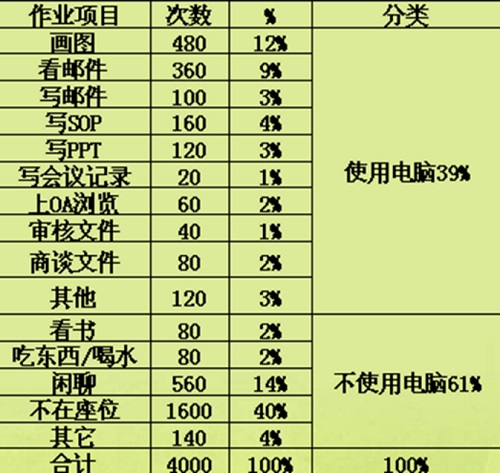 (2)做出結論,改進工作。例:在辦公室,對20臺電腦使用情況實施8天的抽查,每天抽查25次,抽查結果如下表: